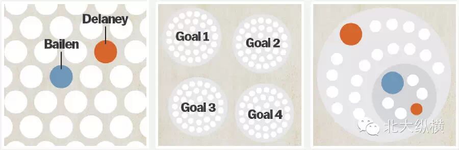 图 1:D 和 B 是一群员工中的两人;图 2:根据不同的技能和目标设定,所有的员工被分配到不同的圈子中,而每个圈子中根据任务的细分还有可能包含自己的二级圈子;图 3:D 是大圈的领导,而 B 是大圈中的二级圈领导,同时 D 也是这个二级圈中的成员。因而,即便 B 把 D 从二级圈中除名,D 仍然是大圈的领导。